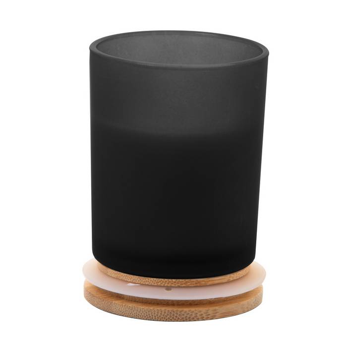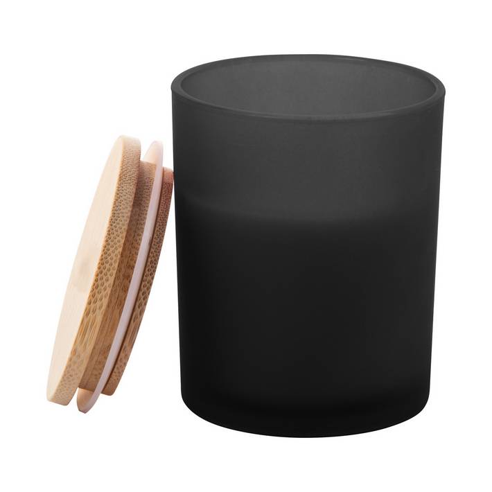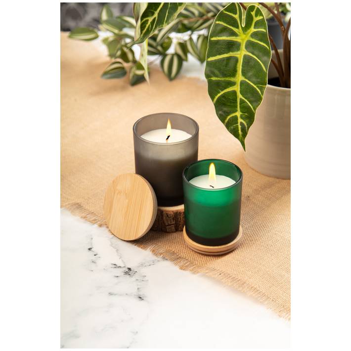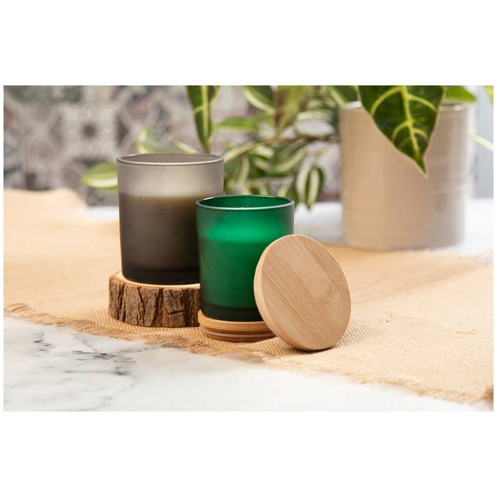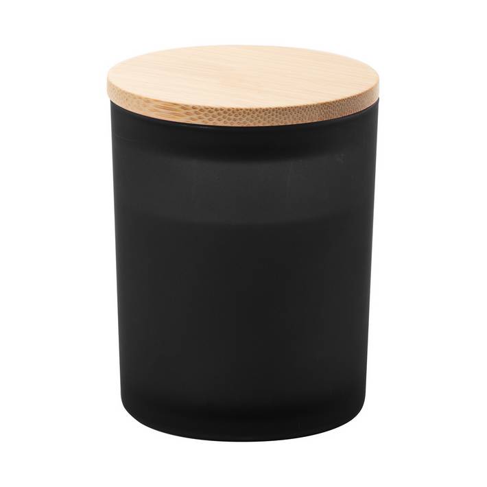 Scented plant-based wax candle in frosted glass holder with bamboo lid. With 200 grams of wax. In kraft paper box.