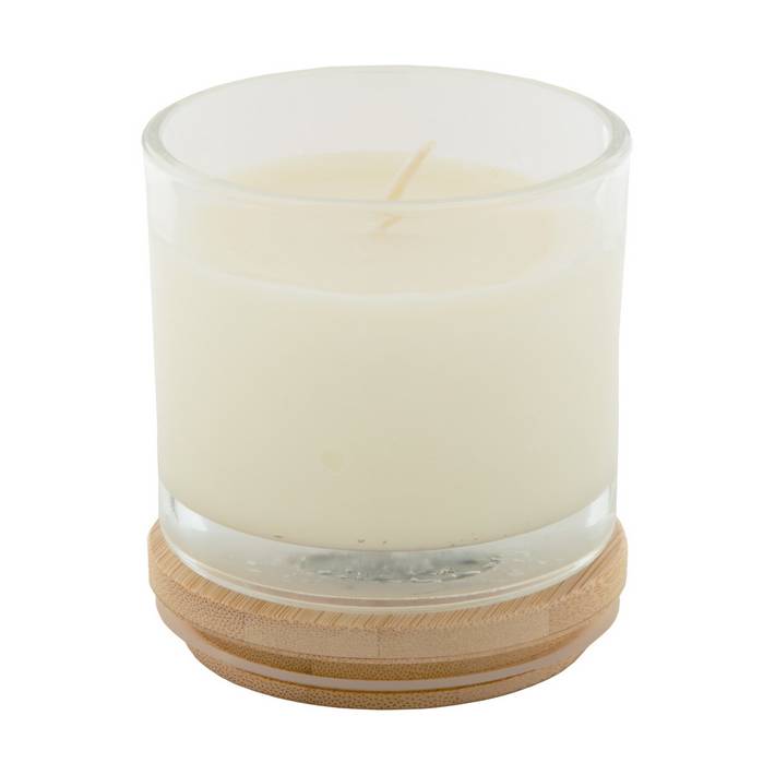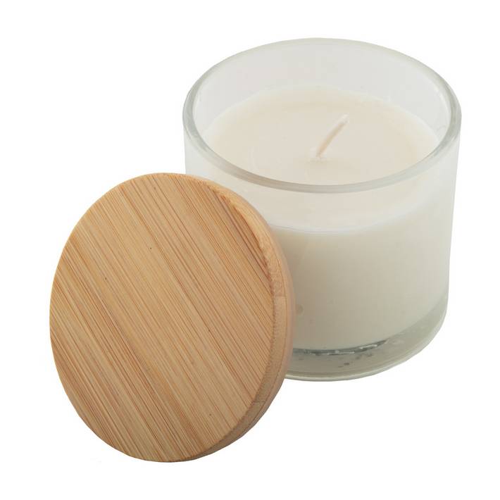 Vanilla scented plant-based wax candle in glass holder with bamboo lid. With 95 grams of wax. In kraft paper box.