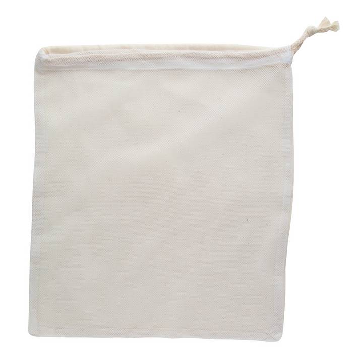 Reusable cotton produce bag with polyester mesh front and drawstring closure, 95 g/m².