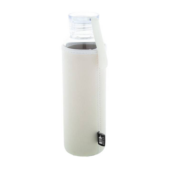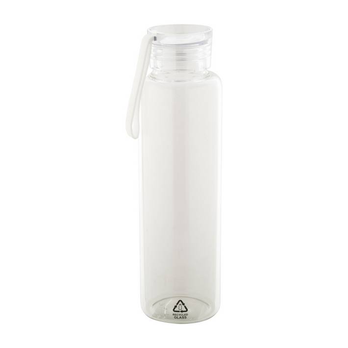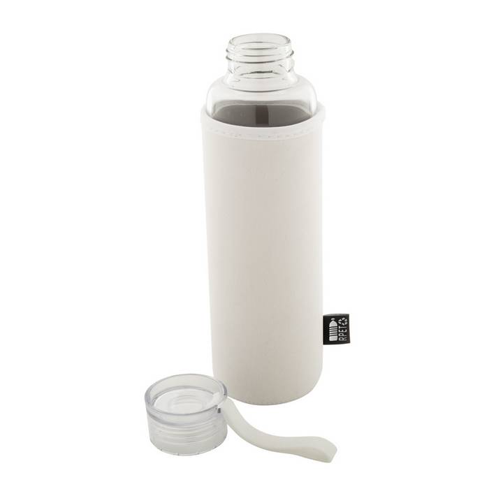 Recycled glass bottle with PS plastic lid, silicone carry strap and RPET neoprene cover, 550 ml. Not suitable for carbonated drinks.Minimalna količina: