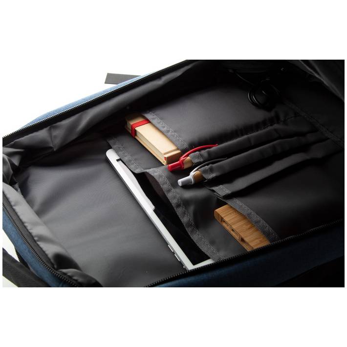 Two-tone backpack with multiple zipped compartments, inside organiser pockets, padded laptop (17") compartment, ergonomic back and shoulder straps. With anti-theft pocket, trolley strap and built-in USB connection for power banks. 400D polyester.Minimalna količina: