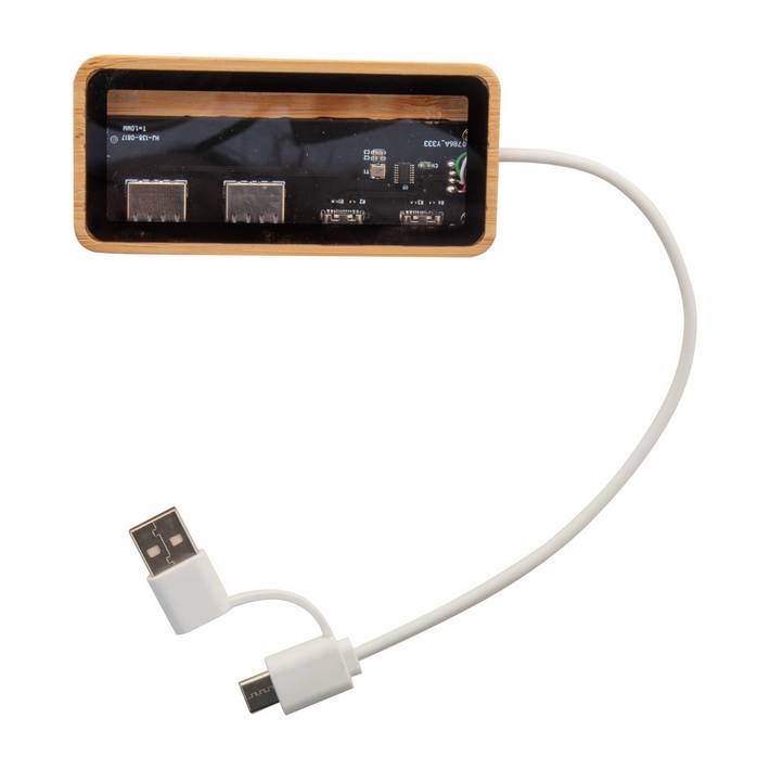 Semi-transparent bamboo USB hub with visible electronic components, 2 USB and 2 USB-C ports, USB 2.0. Including cable with USB and USB-C connections.Minimalna količina: