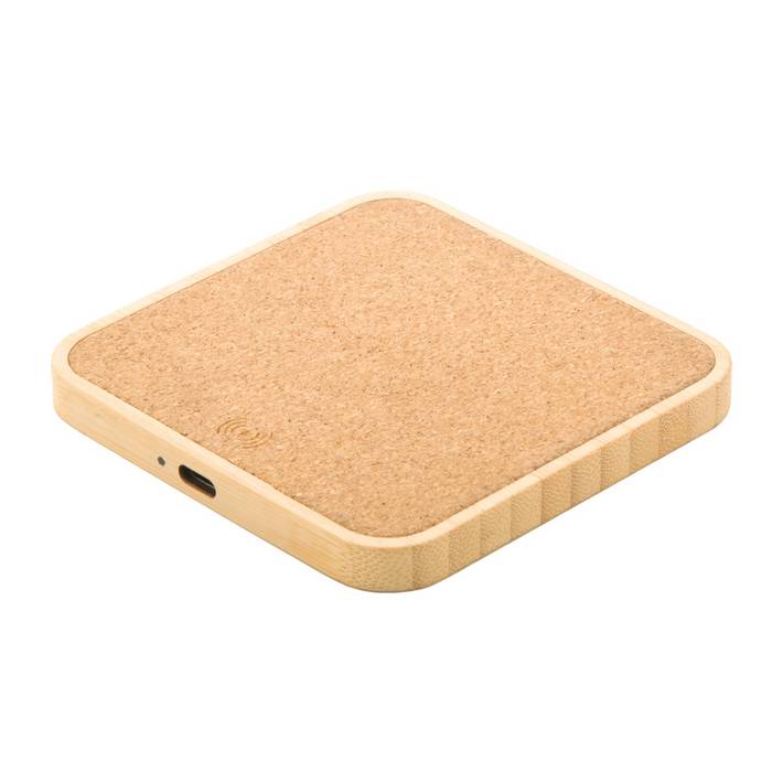 Bamboo and natural cork wireless fast charger (15W). Including USB charger cable.