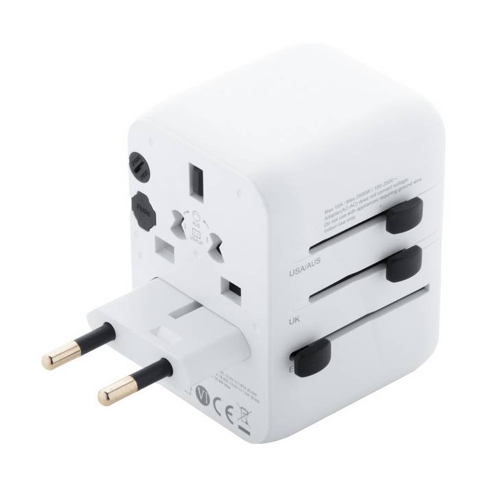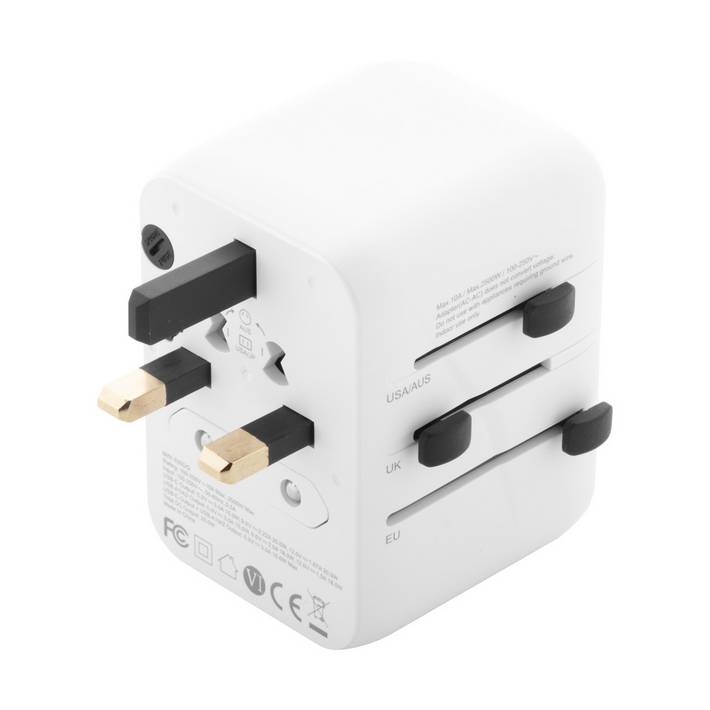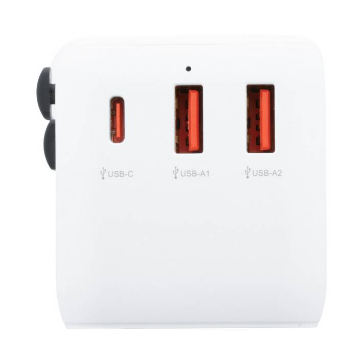 Universal world-wide travel adapter in ABS plastic, with built-in wall plugs for USA, Europe, UK and Australia. With 2 USB and 1 USB-C fast charger ports. Supports quick charging technology (PD20W).Minimalna količina: