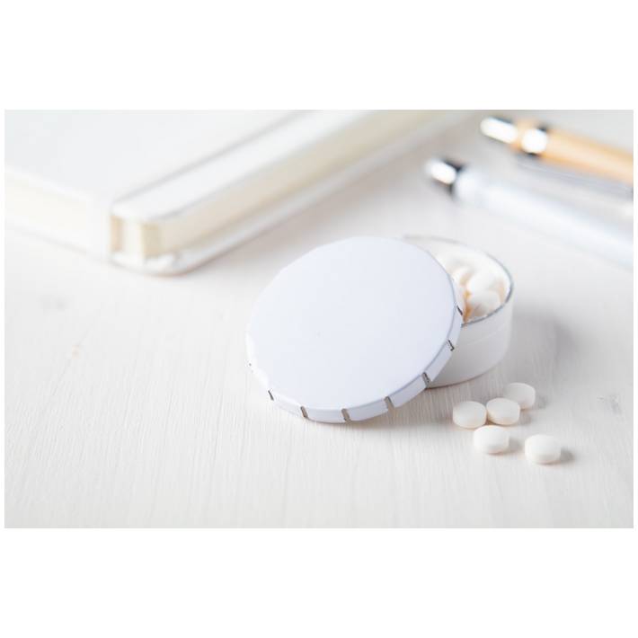 Mint candies in round plastic container with easy-open tin cover. Containing 12 grams of mint candies.