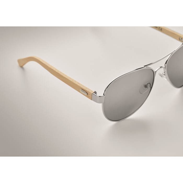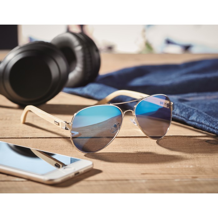 Sončna očala z ročaji iz bambusa in barvnimi zrcalnimi stekli v torbici iz mikrovlaken. UV400 zaščita.