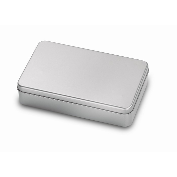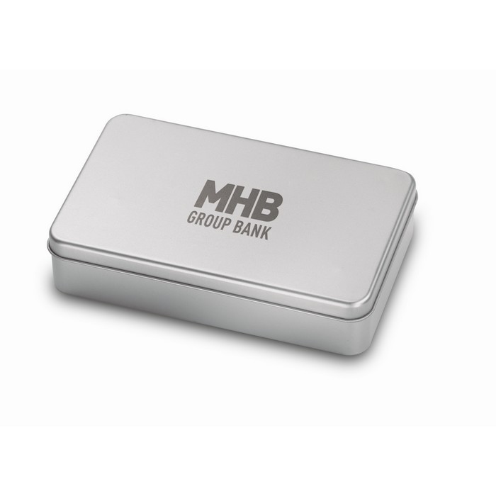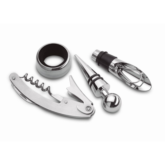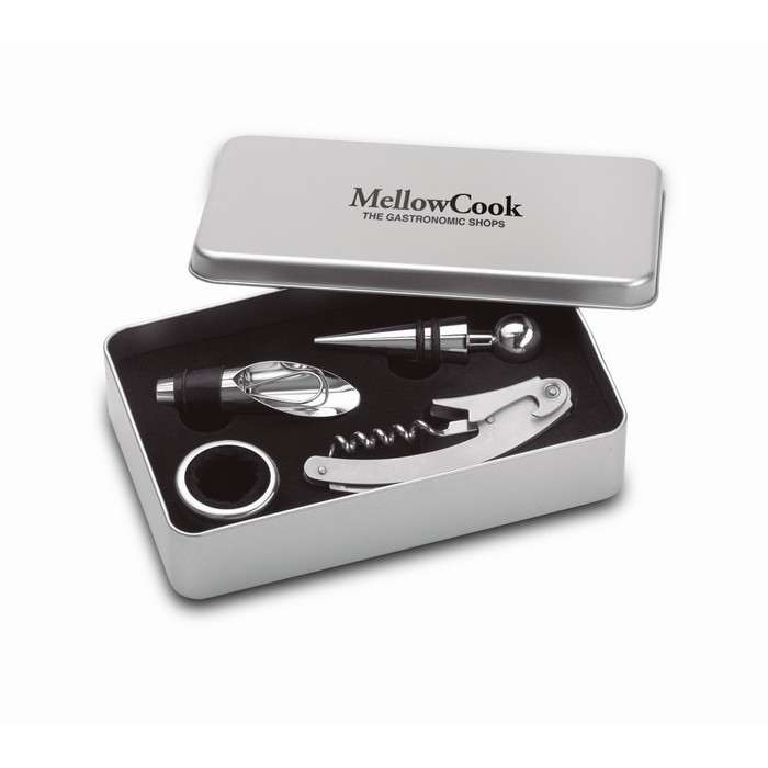 Vinski set, ki vključuje odpirač, zamašek, odcejevalnik in obroč proti kapljanju, v pločevinasti škatli.