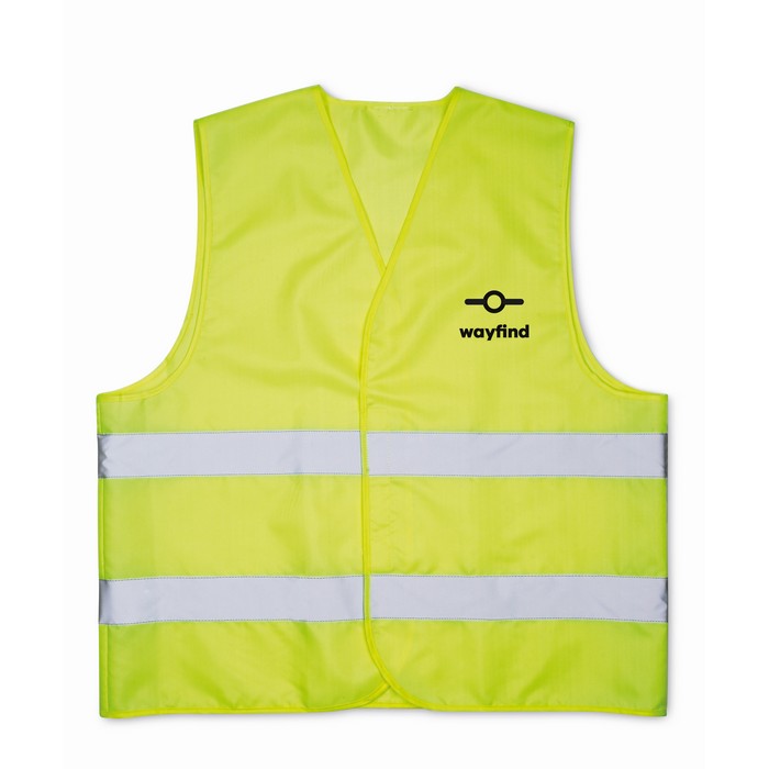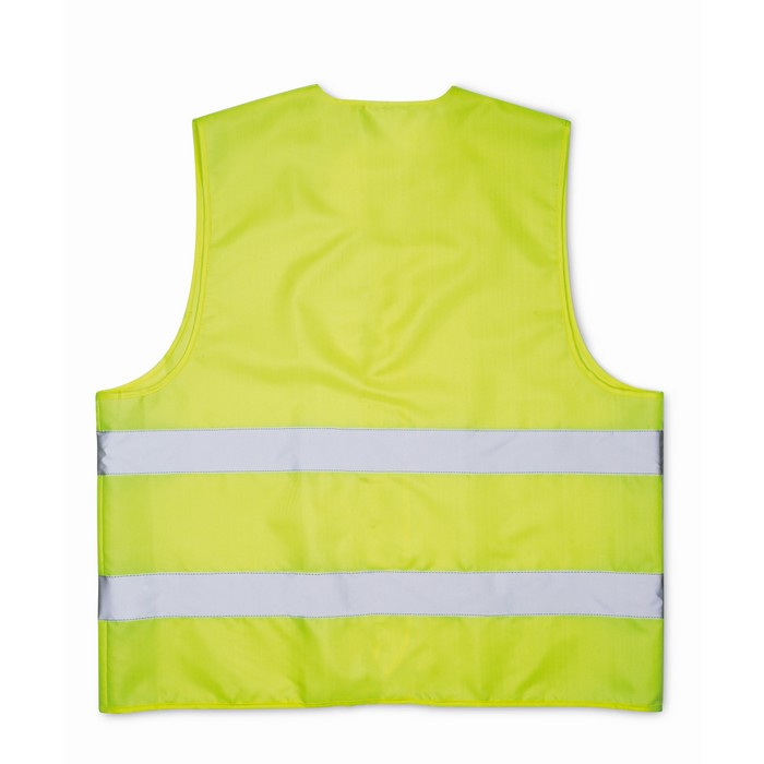 Varnostni jopič iz 100% poliestra z dvema odsevnima črtama za dobro vidljivost.