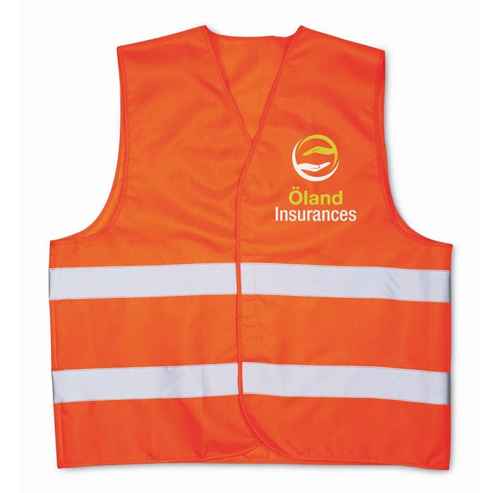 Varnostni jopič iz 100% poliestra z dvema odsevnima črtama za dobro vidljivost.