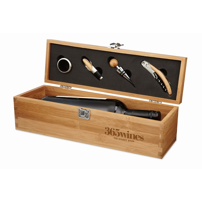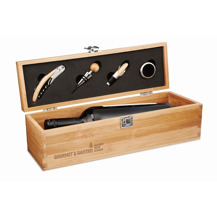 Vinski set iz bambusa, ki vsebuje obroč, odcejevalnik, zamašek, odpirač in prostor za eno steklenico vina. Ne vključuje steklenice. Ker je bambus naravni material, lahko barvni odtenek varira.Minimalna količina: