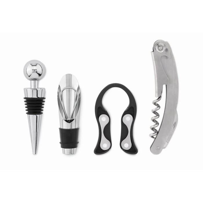 Leseno stojalo s 4 pripomočki za vino, vključuje natakarski nož, zamašek, rezalec za folijo in odcejevalnik.
