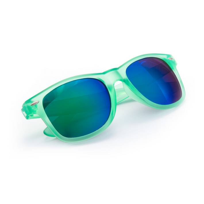 Plastic sunglasses with translucent frame, metallic lenses and UV 400 protection.