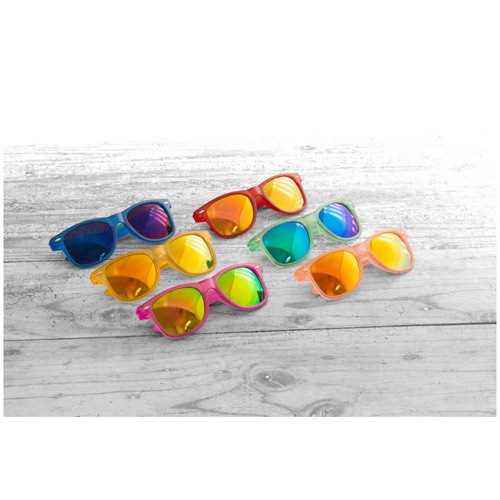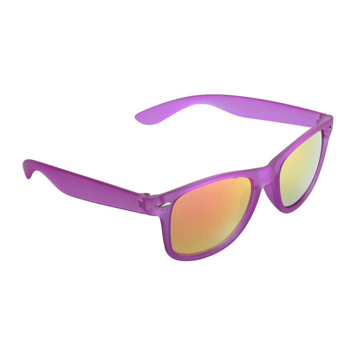 Plastic sunglasses with translucent frame, metallic lenses and UV 400 protection.
