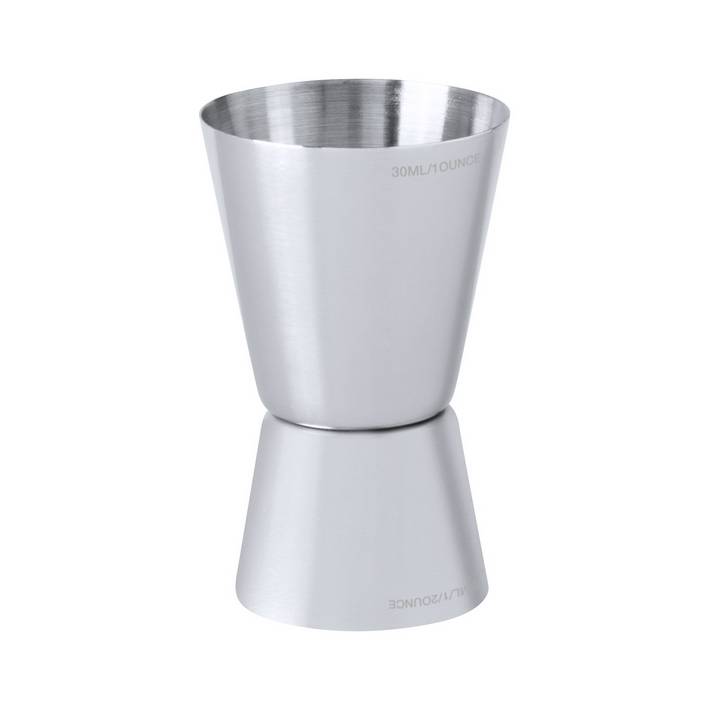 Stainless steel jigger to measure 1 or 1/2 ounce.