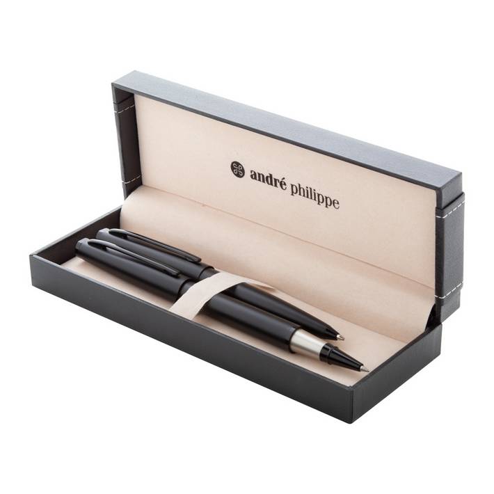 Elegant, metal ballpoint and roller pen set with matte black finish. In special paper gift box, with blue refill. André Philippe brand product.Dobavni rok (dnevi)